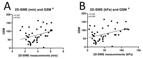 Correlation between 2D-SWE in m/s (A) and kPa (B) and grayscale median (GSM) of carotid plaques. * p ≤ 0.05 using Spearman’s rank correlation.