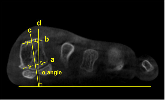 To obtain the alpha (α) angle, first, an inferior line is drawn between the lateral edge of the lateral sulcus and the medial edge of the medial sulcus (a). Subsequently, a superior line is drawn between the point of the medial and lateral corners of the first metatarsal head (b). Second, bisections of the above 2 lines are connected to a straight line perpendicular to the horizontal ground axis (c). Third, the angle is measured between the straight line (c) and the vertical line perpendicular to the ground axis (d) that is obtained from the first step.
