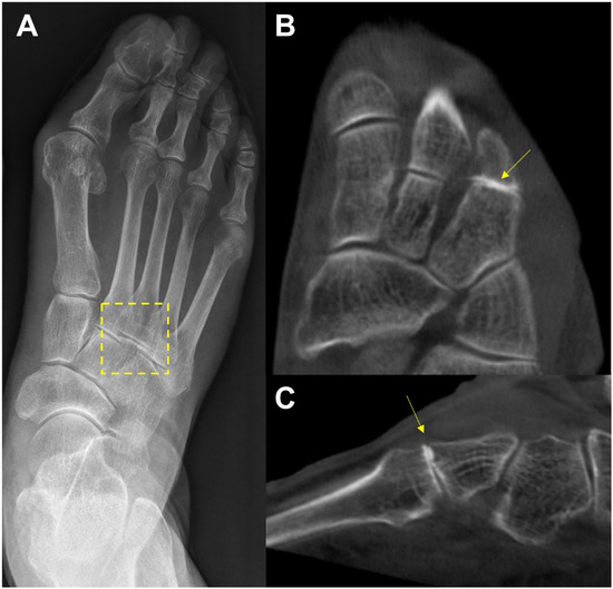 - Tamir, E.; Essa, A.; Levi, A.; Beit Ner, E.; Kachko, E.; Finestone, A.S. Lisfranc Injury Diagnosis: What Is the Diagnostic Reliability of New Radiographic Signs Using Three-dimensional CT? Clin. Orthop. Relat. Res. 2023, 481, 2271–2278. [Google Scholar] [CrossRef]