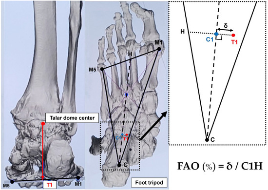 Foot–ankle offset (FAO). First, the most plantar aspect of the M1, the most plantar aspect of the M5, and the most plantar aspect of the calcaneal tuberosity (C) are marked to create the foot tripod. Then, the talar dome center (T1) is established on the foot tripod. The FAO represents the percentage of ankle deviation from the tripod’s center (C1) (Figure 2).