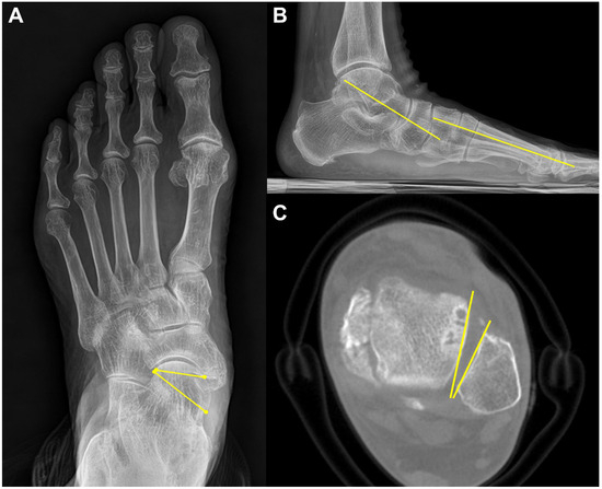 - Baverel, L.; Brilhault, J.; Odri, G.; Boissard, M.; Lintz, F. Influence of lower limb rotation on hindfoot alignment using a conventional two-dimensional radiographic technique. Foot Ankle Surg. 2017, 23, 44–49. [Google Scholar] [CrossRef] [PubMed]