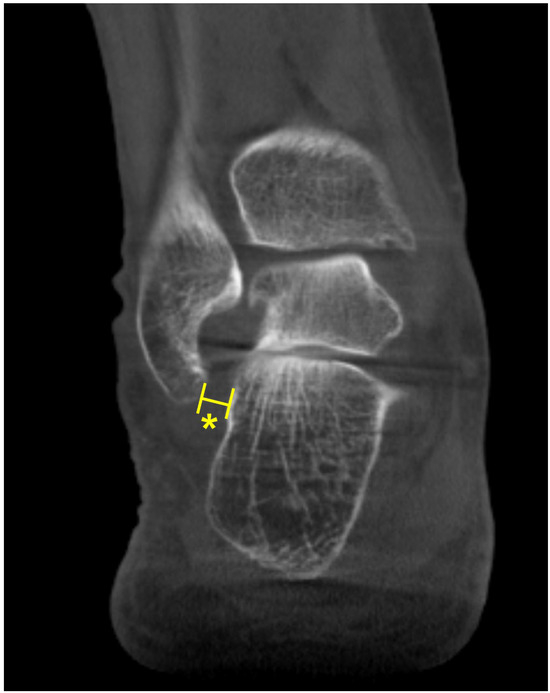Talocalcaneal distance. (A) Using the sagittal view for reference, the most inferior point of the lateral process is identified. (B) At this point, the narrowest distance between the inferior border and the calcaneal floor is measured in the selected coronal slice (Asterisk).