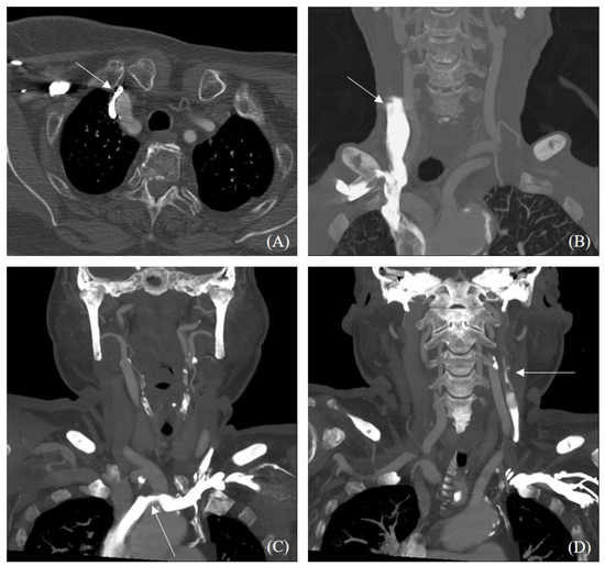 - Tanaka, T.; Uemura, K.; Takahashi, M.; Takehara, S.; Fukaya, T.; Tokuyama, T.; Satoh, A.; Ryu, H. Compression of the left brachiocephalic vein: Cause of high signal intensity of the left sigmoid sinus and internal jugular vein on MR images. Radiology 1993, 188, 355–361. [Google Scholar] [CrossRef]