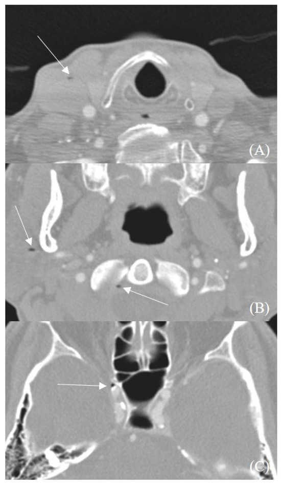 - Canavan, L.; Osborn, R. Dural sinus air without head trauma or surgery: CT demonstration. J. Comput. Assist. Tomogr. 1991, 15, 526–527. [Google Scholar] [PubMed]