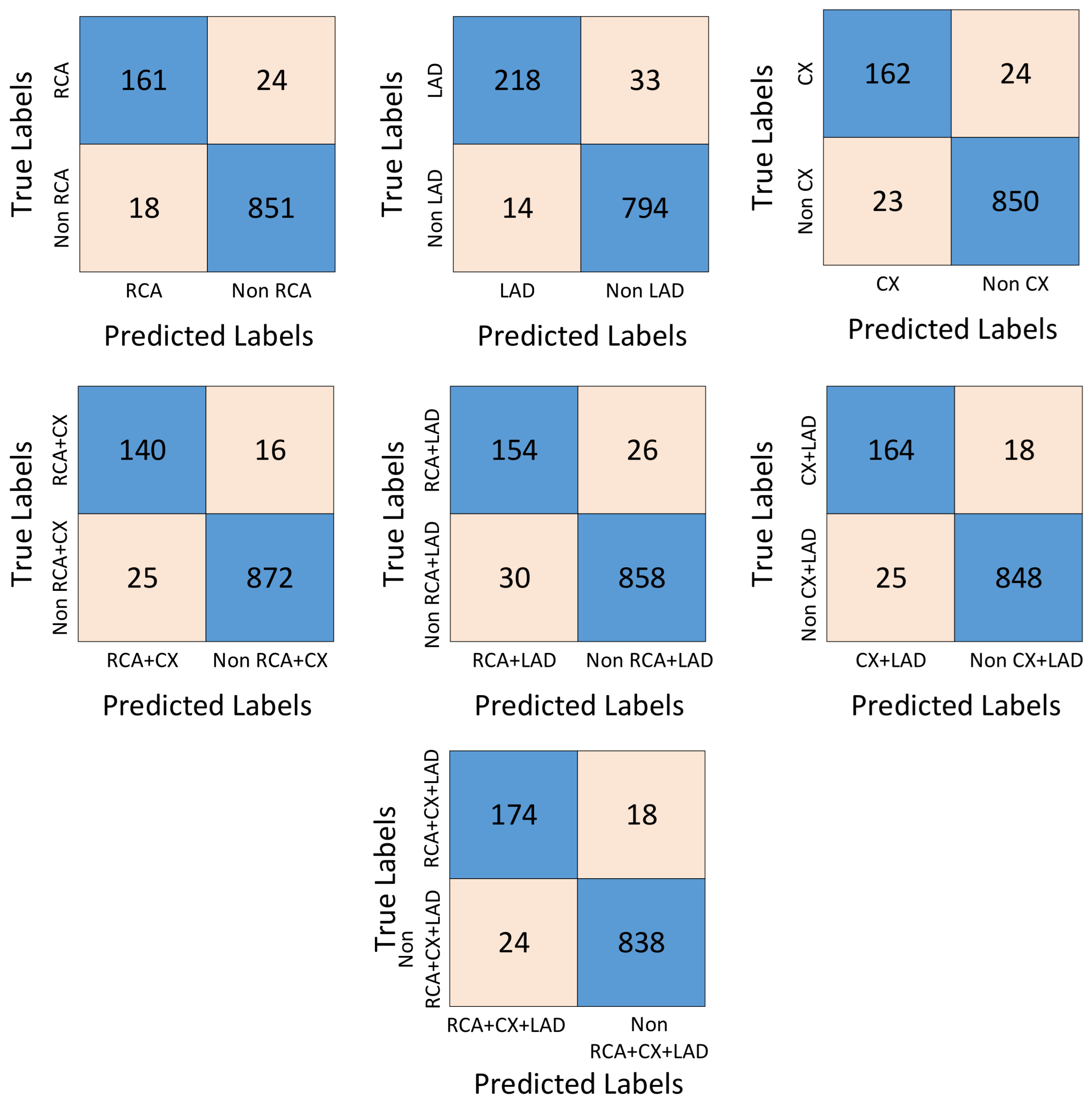 In terms of combined conditions, the RCA + CX class recorded 140 true positives and 872 true negatives, with just 16 false positives and 25 false negatives, maintaining a high balance between sensitivity and specificity. The RCA + LAD class achieved 154 true positives and 858 true negatives, alongside 26 false positives and 30 false negatives, showcasing consistent performance. For the CX + LAD class, 164 true positives and 848 true negatives were observed, with minimal false positives (18) and false negatives (25). Finally, the RCA + CX + LAD class achieved the highest overall true positive rate (174) and true negatives (838), with relatively few false positives (18) and false negatives (24), indicating the model’s strong capability to classify more complex cases involving multiple coronary artery conditions.