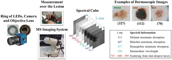 Chromophores in the skin, such as melanin, hemoglobin, water, beta-carotene, collagen, and bilirubin, differ among skin lesions of different etiologies. MS imaging systems can sequentially illuminate skin with light at different spectral bands and collect the reflected light that contains information on these chromophores. In a previous work [45], we developed an LED-based, low-cost, and portable MS system that was able to capture reflectance and color features in the VIS-NIR range. The camera integrated in the head of the hand-held instrument is a CCD sensor with 12-bit depth and resolution of 1280 pixels × 960 pixels (Sony ICX445ALA, Sony Corporation, Tokio, Japan). A lens is coupled to the camera to focus the skin at 40 mm with a field of view of 15 mm × 20 mm (Cinegon, Schneider-Kreuznach, Bad Kreuznach, Germany). A ring of LEDs with peaks at eight different spectral bands (414, 447, 477, 524, 671, 735, 890, and 995 nm) was used to illuminate the skin and obtain a spectral cube for each analyzed lesion. A couple of crossed polarizers were incorporated to eliminate specular reflection from the sweat and grease of the skin. With this device, the spectral cubes of +700 equivocal lesions were acquired from patients that attended the outcare patient clinic in the Melanoma Unit of the Dermatology Department from the Hospital Clinic i Provincial de Barcelona (Spain) and the Skin Cancer Unit from the Policlinico di Modena-University of Modena and Reggio Emilia (Italy). Some spectral cubes had to be discarded due to lack of pigmentation of the lesion, a greater size than the field of view of the lesion, motion artifacts, or hair growth. Finally, the number of lesions from each etiology that were included were 592, from which 332 (56.1%) corresponded to nevi (melanocytic, dysplastic, blue, junctional, and Spitz nevi), 112 (18.6%) were MMs (including MM in situ and lentigo), 70 (11.6%) were BCCs, 33 (5.4%) were SK, 43 (7.1%) were other benign lesions, such as, angiomas, dermatofibromas, and actinic keratosis, and 7 (1.2%) corresponded to SCCs. In order to be left with a comparable and sufficiently high number of lesions for each class, nevus (327), MM (112), and BCC (70) were the three classes used to feed the DL architectures. The MS system, spectral cube content, and samples of dermoscopic images out of the three lesion classes are illustrated in Figure 1. The diagnosis of the different lesions in the dataset stated by physicians in the dataset are presented in Table 3.