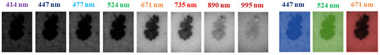 In some training instances, an additional preprocessing step was implemented to choose only three images from the reflectance cube at the spectral bands 447, 524, and 671 nm, which were the ones closer to the peak wavelengths of the RGB channels of a conventional camera. In Figure 2, there is the full MS set of images and these three images.