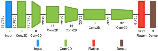 Simple custom 2D-CNN: It has an input layer ready to accept the reflectance cube (128, 128, 8), followed by six convolutional layers with ReLu activation; 8, 16 and 32 filters, with kernel size 3; stride 1 in the odd layers, and stride 2 in the even layers. In this case, the features in the reflectance cube are extracted from each individual image, not from the whole cube at once. It has a final dense layer with Softmax activation. The total number of trainable parameters of the small customized 2D-CNN is 43,123. The model is represented in Figure 4.