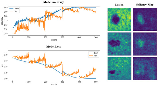 Accuracy and loss were also monitored during training and validation. Similarly, the saliency or attention maps of the models were inspected. In Figure 6, the learning curves and saliency maps for the 3D VGG-16 model are represented.