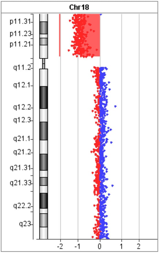 The result of array-CGH of the patient. Zero value indicates equal fluorescence intensity ratio between the sample and reference. Copy number losses shifted the ratio toward left (red) whereas copy number gains towards the right side (blue). Our result showed the deletion of short arm from 18p11.32 to p11.21 region (14.79 Mb).