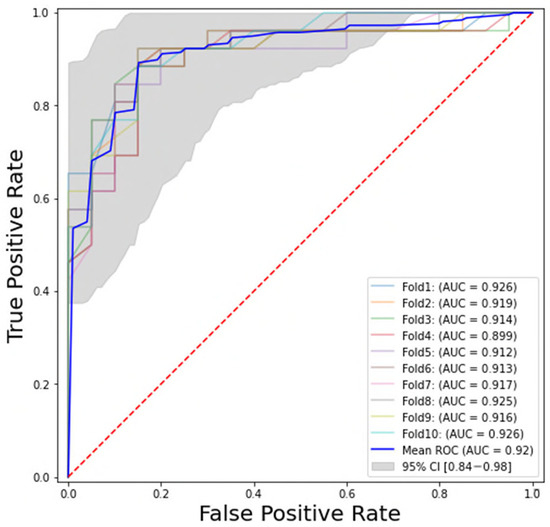 Of the 95 extracted features, 46 features had a Pearson’s r value higher than 0.9 and were removed from the dataset. Among all 441 combinations, the ten-feature model with ANOVA feature selection and a random forest classifier was selected as the final model. The performance of this model was calculated on the test set, showing the following values: AUC = 0.92 ± 0.01, PPV = 0.89 ± 0.04, and NPV = 0.82 ± 0.05. The ROC curve of this model is shown in Figure 2.