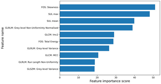The feature importance of the final model is illustrated in Figure 3. The final model based its outcome on four intensity features (including SULmean and SULmax) and six texture features. The four intensity values showed significantly higher values for the GCA group (p < 0.001). The normalised GLRLM grey-level non-uniformity and GLCM lmc2 were the most important texture features. The GLRLM feature showed lower values for the GCA group (p < 0.001), whereas the GLCM feature showed higher values for the GCA group (p < 0.001).