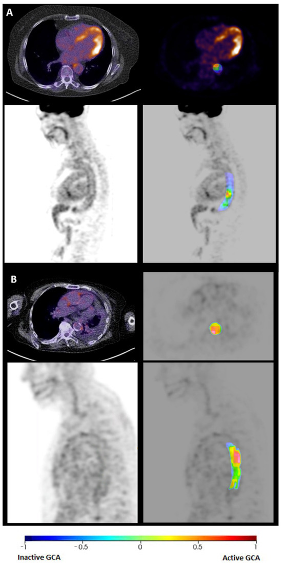 Giant cell arteritis (GCA) is a systemic inflammatory condition primarily affecting the vessel walls of the aorta, its main branches, and the arteries in the head and neck region [1]. This inflammation can lead to arterial stenosis and weakening of the aortic wall, which can cause ischemia in downstream tissue and aortic aneurysm formation. Accurate diagnosis is essential to prevent severe outcomes, including vision loss or fatal complications [2,3]. However, diagnosing GCA is challenging due to its often-nonspecific symptoms. Currently, the diagnosis relies strongly on clinical findings and various imaging modalities, i.e., computed tomography (CT), magnetic resonance imaging, ultrasound, and 2-deoxy-2-[18F]fluoro-D-glucose positron emission tomography ([18F]FDG-PET) [4]. However, each of these imaging techniques has its unique limitations. While CT can effectively detect calcified plaques, it struggles with identifying non-calcified, fatty plaques, and has difficulty distinguishing atherosclerosis from vasculitis, which can lead to misdiagnosis. MRI, although non-invasive, is not typically used as a primary imaging modality for GCA due to limited evidence supporting its effectiveness in visualising vascular inflammation [5]. Due to the increased glycolytic activity of activated inflammatory cells, [18F]FDG serves as a potential indicator of inflammation [6]. [18F]FDG PET/CT has a high diagnostic sensitivity and specificity for GCA [7,8]; however, its ability to distinguish active disease from remission in patients during treatment is moderately effective [9].