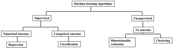 ML algorithms have three main subcategories (supervised, unsupervised, and reinforcement learning) (Figure 1). Unsupervised ML involves analyzing and clustering unlabeled datasets to uncover hidden patterns or groupings. Its ability to identify similarities and differences in data makes it particularly useful for exploratory data analysis. Unsupervised ML models are employed for clustering and dimensionality reduction tasks. On the other hand, supervised ML uses a training set containing input–output pairs to teach the algorithm to learn a function that maps inputs to outputs. The key distinction between supervised and unsupervised ML is that the former requires labeled data (input–output pairs), while the latter only requires inputs (unlabeled data). Supervised ML models are utilized for tasks such as classification, which involves assigning data to specific categories (e.g., diabetic or nondiabetic), and regression, which entails learning the relationship between input features and continuous outcomes, such as BMI. Reinforcement learning is currently integrated into robotics engineering, and its application in medical research has yet to be well-developed [30].