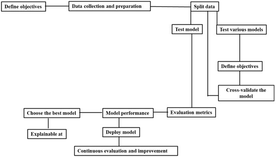 Almost all supervised ML or DL models involve similar steps for practical use in healthcare research and treatment to improve patient outcomes and decision-making processes. These steps are defining objectives (clearly define the research question or clinical problem you want to address, such as disease diagnosis, prognosis prediction, or treatment recommendation), data collection (gather relevant healthcare data from sources such as electronic health records (EHRs), medical imaging, genetic databases, or clinical trials), data preprocessing (clean the data, handle missing values, normalize features, and encode categorical variables to prepare for modeling), split data (divide the dataset into training and testing sets to train and evaluate the model’s performance), training the model (use the training data to train the respected model, adjusting hyperparameters, cross-validating the model), validating the model (assess the model’s performance on the testing data using metrics such as accuracy “the proportion of correct predictions out of the total number of predictions”, precision “True positive (TP)/(TP + false positive(FP))”, recall “TP/(TP + false negative (FN))”, area under the receiver operator curve (aucROC) “model’s ability to distinguish between positive and negative classes” and F1-score “2* (Precision ∗ Recall)/(Precision + Recall”), interpreting results (analyze feature importance to understand which variables influence predictions and gain insights into disease mechanisms or treatment responses using explainable AI methods), deploying the model (if the model performs well, deploy it in clinical settings to assist healthcare professionals in decision-making), and monitoring and updating (continuously monitor the model’s performance and update it as needed with new data or changes in healthcare practices) (Figure 3) [30].