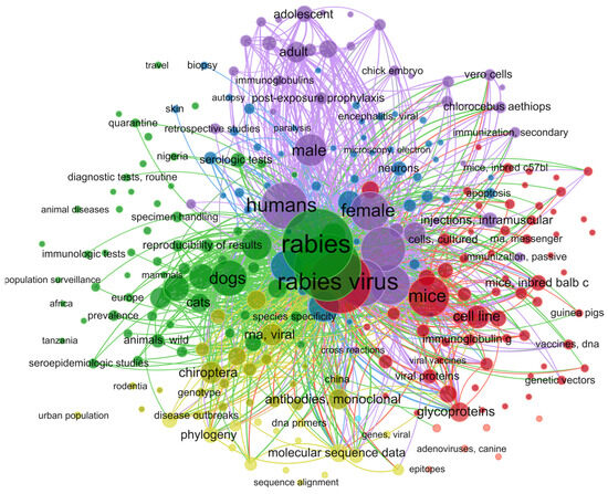 We utilized the MeSH terms “Rabies” and “Laboratory Diagnosis” to identify related terms for diagnosing rabies in the biomedical literature. Visualization was obtained by creating a network diagram of MeSH term co-occurrence using VOSviewer software (version 1.6.20) [32]. To provide more focus on searching for terms related to tests, we checked clusters within the network map. Subsequently, a second round of searches resulted from the combination of each MeSH term obtained in the cluster analysis with the MeSH terms “sensitivity and specificity”, which, meanwhile, are standard indicators for the evaluation of test performance in the clinical field [33], and “rabies”. Bibliographic studies were retrieved from the PubMed database (https://pubmed.ncbi.nlm.nih.gov/; last accessed 12 June 2024) between 1990 and 2024.