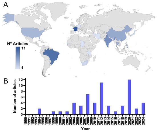 Mapping and temporal trends of rabies diagnostic research. (A) Geographical distribution: The map represents the number of rabies diagnostic studies published per country. Countries are shaded according to the number of studies, ranging from 1 (light blue) to 11 (dark blue). (B) Temporal trend: The bar chart shows the annual number of rabies-diagnostic studies published between 1990 and 2024.