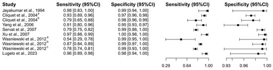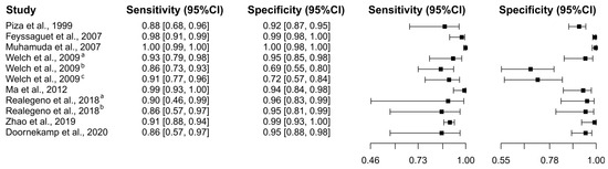 Twelve studies based on the RIT test were selected [61,71,76,77,78,81,86,87,88,89,92,96], in which a total of 3354 subjects were studied. Sensitivity ranged from 0.06% to 99.4%, with a median of 93.5%, 95%CI (83.7, 97.1), while the test for equality of sensitivities presented a χ2 = 718.06, df = 14, p-value ≤ 2.00 × 10−16. Specificity ranged from 91.6 to 99.7%, with a median of 99.1%, 95%CI (95.2, 99.9); the test for equality of specificities showed χ2 = 39.42, df = 14, p-value = 3.14 × 10−4. A negative correlation between sensitivities and false positive rates is shown r = 0.147, 95%CI (–0.395, −0.613). Additionally, results regarding LR+ {median 84.17, 95%CI (11.14, 1092.63)}, LR− {median 0.07, 95%CI (0.03, 0.18)}, and DOR {median 1235.61, 95%CI (82.26, 20,837.39)}. The analyzed diagnostic performance is summarized in Figure 9 and Supplementary Figure S5.