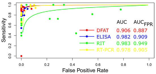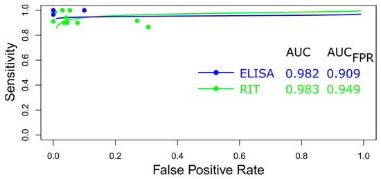 A comparative analysis of data for human rabies diagnostic tests (ELISA and RT-PCR) was performed using an sROC curve (Figure 6). The observed differences in sensitivity and specificity are likely attributable to inherent or explicit variations between studies and differences in test cut-off points [98,99,100]. Figure 6 illustrates the area under the curve (AUC) for the rabies diagnostic tests, indicating the superior performance of ELISA. Additionally, both diagnostic tests demonstrated relatively high efficacy for detecting rabies in humans when the AUC was confined to the observed false positive rate (FPR) (AUCFPR) (Figure 6).