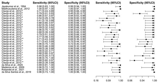 Study data and paired forest plot of the sensitivity and specificity of Enzyme-Linked Immunosorbent Assay (ELISA) for rabies diagnosis in dogs. Data from each study are summarized. Sensitivity and specificity are reported with a mean (95% confidence limits). The Forest plot depicts the estimated sensitivity and specificity (black squares) and its 95% confidence limits (horizontal black line) [69,75,80,93,94,95,97,101].