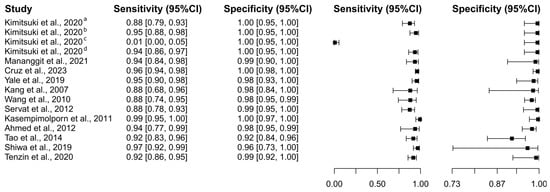 The numbers of true negatives (TN), false negatives (FN), true positives (TP), and false positives (FP) were analyzed for each diagnostic test. Diagnostic accuracy was assessed by considering sensitivity and specificity. Sensitivity, or the true positive rate, is calculated as TP/(TP + FN), indicating the probability of a positive result in subjects with the disease. Specificity, or the true negative rate, is defined as TN/(TN + FP), representing the probability of a negative result in subjects without the disease.
