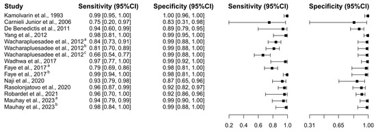 For the diagnostic tests: Indirect Immunofluorescence Test (IIFT) [49], Latex Agglutination Test (LAT) [50], Dot Blot Enzyme Immunoassay (DBEI) [51], Rapid Neutralizing Antibody Test (RNAT) [56], Immunoperoxidase Inhibition Assay (IPIA) [27], Direct Rapid Immunohistochemical Test (DRIHT) [52], and FAVNT [45], only one study was included in the selection. Based on the established criteria, a minimum of five studies with a p-value of less than 0.05 were required for analysis. Consequently, no analysis was conducted for these diagnostic tests.
