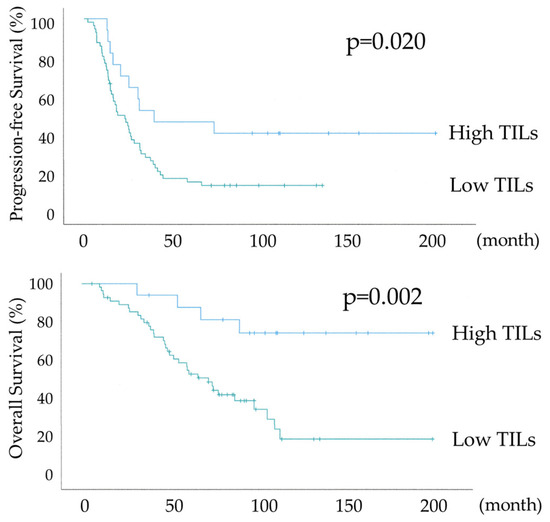 Figure 3 shows the differential Kaplan–Meier PFS and OS curves in all 74 HGSOC cases for the high or low TILs. The median PFSs were 38 months (range 28–93) in 17 patients with HGSOC with high TILs and 22 months (range 15–28) in 57 women with HGSOC with low TILs, and their median OSs were not available and 68 months (range 49–86), respectively. Both PFS and OS were significantly prolonged in the high TILs group (p-values = 0.020 and 0.002, respectively), with an overall survival of >70% at 120 months in the high TILs group.