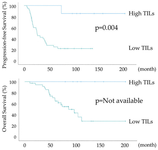 Figure 3. Kaplan–Meier survival curve analyses of the progression-free survival and overall survival in all 74 cases of high-grade serous ovarian carcinoma with or without abundant tumor-infiltrating lymphocytes (High TILs: 17, Low TILs: 57).