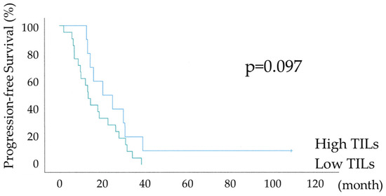 Figure 5 shows the differential Kaplan–Meier PFS and OS curves in the suboptimal surgery group for the high or low TILs. The median PFSs were 20 months (range 7–32) in 10 patients with HGSOC with high TILs and 13 months (range 10–15) in 21 women with HGSOC with low TILs, and their median OSs were 58 months (range 34–81) and 39 months (range 22–55), respectively. PFS showed a significant trend, whereas OS was significantly prolonged in the High TILs group (p-values = 0.097 and 0.012, respectively). In the high TILs group, >50% OS was observed at 120 months. The lack of a significant difference in PFS is because the suboptimal surgery group had a higher risk of recurrence, as the gross residual tumor size at surgery was >1 cm.