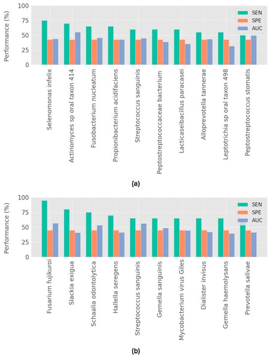 Top 10 best single biomarker predictors for (a) biofilm data, (b) saliva data. Performance metrics for each microorganism biomarker are depicted by different colors, where each color indicates the model’s sensitivity (SEN), specificity (SPE) and the ROC-AUC.