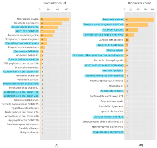 Frequency counts of the microorganisms found in the combinations of microorganisms found in the ML-driven biomarker scoring models: (a) biofilm microbiome data; (b) saliva microbiome data. Microorganism species names are depicted in the vertical axis and their counts in the horizontal axis. Names highlighted with a color indicate microorganisms identified with statistical significance.