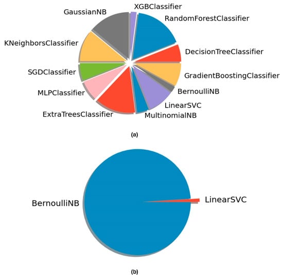 Optimal ML algorithms for the generated model classifiers using TPOT. (a) Algorithms obtained using the (a) biofilm dataset and the (b) saliva dataset. Names depicted in the pie charts indicate the name of the main algorithm behind the automatedly generated classifier pipelines, obtained from the TPOT framework. Variations in obtained pipelines, including pre-processing methods and hyperparameter settings, were not considered.