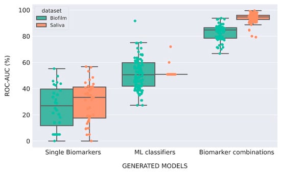 Comparison of the AUC values of the generated models using different approaches for biofilm and saliva data. The analysis of models from the biofilm dataset is depicted in green and the ones from saliva dataset depicted in orange. Boxplot limits indicate 95% intervals and the color-filled dots represent all AUC values’ distribution across the respective grouped dataset.