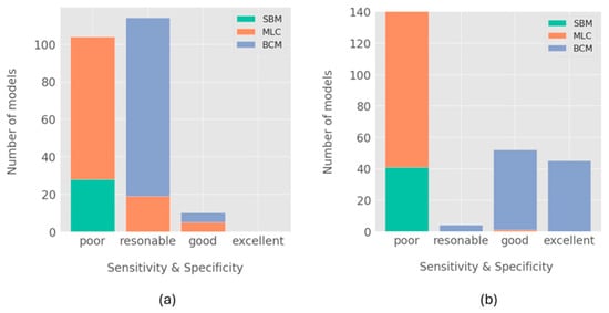 Number of generated models is classified according to distinct classes of performances: (a) models generated with biofilm dataset; (b) models generated with biofilm dataset. Single-biomarker models (SBM) are indicated in green, machine learning classifiers (MLCs) in orange, and biomarker combination models (BCMs) in blue. Classifiers with poor performance classification were considered to have a sensitivity or specificity below 70%. Reasonable-performance models were considered to have a sensitivity and specificity in the range of 70% up to 79%, whereas good performance was in the range of 80% up to 89%, and excellent models had a performance of above 89%.
