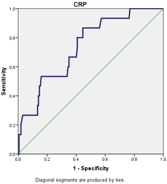 For a cut-off value of 221.5 for CRP, the AUC (area under the curve) was 0.739 (95% CI: 0.619–0.859), which reflects that CRP is a fair predictor for the severity of AP (Figure 1).