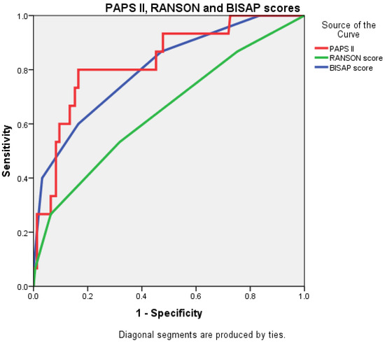 Receiver operating characteristic (ROC) curve comparing the predictive accuracy of BISAP, RANSON, and PAPS II.