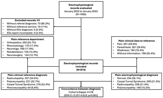 It was found that only 602 (61.8%) of the clinical diagnoses were corroborated by electrophysiological study; the concordance between the reference clinical diagnosis and the electrophysiological diagnosis was 0.578 (95% CI: 0.537–0.619; p < 0.001). Moreover, the concordance between the referral diagnoses and those reported by the EDx laboratory showed that Guillain–Barré syndrome had the highest value (0.826; 95% CI: 0.699–0.952), followed by amyotrophic lateral sclerosis (0.783; 95% CI: 0.613–0.952), myopathy (0.746; 95% CI: 0.639–0.853), and carpal tunnel syndrome (0.751; 95% CI: 0.700–0.802). Diagnoses with lower concordance included multiplex mononeuropathy (0.350; 95% CI: 0.166–0.534) and plexopathy (0.451; 95% CI: 0.255–0.647) (Table 1).