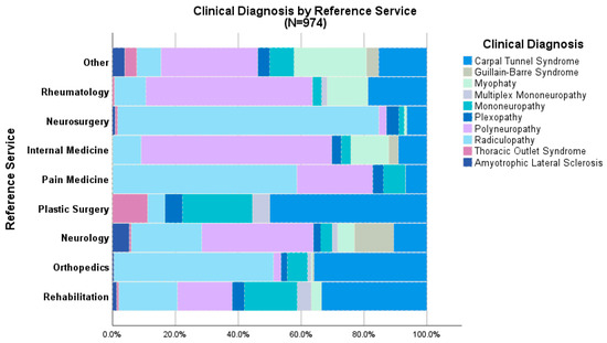 It is well known that electrophysiological studies are considered an extension of the clinical evaluation (clinical presentation and physical examination). However, their ability to confirm the clinical diagnosis fluctuates between 40% and 57.6%. This variability can depend on the pathology and the experience of the physician ordering the study [13,14]. Unfortunately, in the present study, approximately 26% of patients undergoing electrodiagnostic evaluation were reported as normal. Although this percentage is lower than that observed in other studies where the frequency of normal study results can reach up to 31.1% to 49.8%, it suggests that adequate documentation of the patient’s clinical presentation and physical examination could significantly improve the diagnostic accuracy of electrophysiological studies and potentially avoid unnecessary testing [15,16,17].