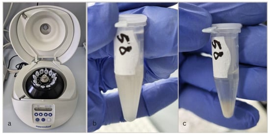 - Centrifugation—to remove cell debris or precipitates, the unstimulated saliva samples were centrifuged for 5 min at 5400 rpm using the MiniSpin Eppendorf (Eppendorf SE, Eppendorf SE, Germany, 2021) (Figure 1a–c).