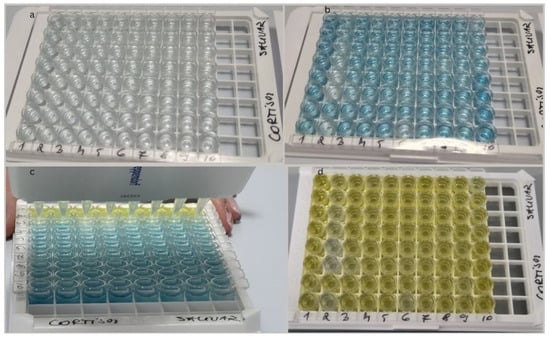- Stop reaction: stopping solution was added, which turned the color to a deep yellow (Figure 3c,d).