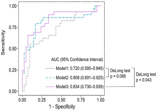 Figure 1 shows the area under the curve (AUC) of each model to predict successful labor induction. The AUC of Model 1, which included maternal age, BMI, and gestational age, was 0.720, with a sensitivity of 55.2% and specificity of 83.3% (Supplementary Table S2). The AUC of Model 2, which combines Model 1 and the Bishop score (≥3), was 0.808 with a sensitivity of 55.2% and specificity of 85.7%. The AUC of Model 3, which is Model 2 and the IOS/EOS ration (≥1), shows a sensitivity of 69% and specificity of 85.7%. The AUC increased from 0.720 in Model 1 to 0.834 in Model 3, and the Delong test showed a significant difference in the p-value.