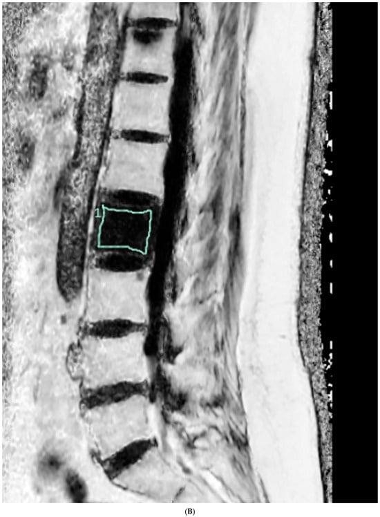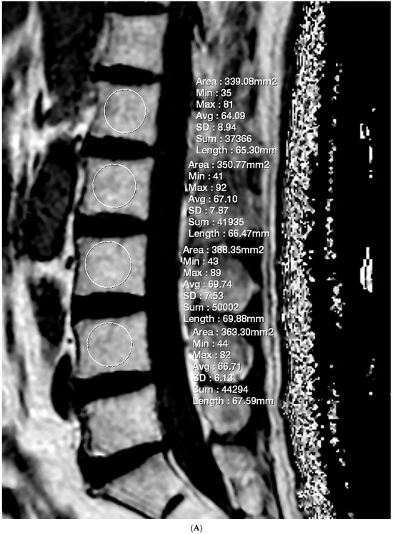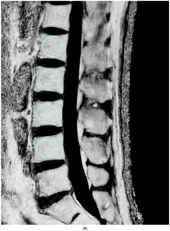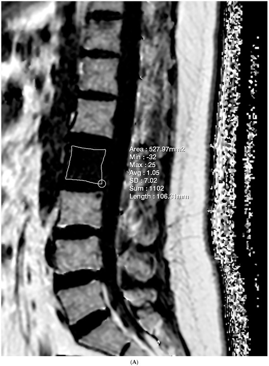 The VBQ score measurement was performed on sagittal T1-weighted images using the method described by Ehresman et al. [16]. Similarly to FF measurements, elliptical ROIs were independently drawn by two investigators on the midline sagittal image (Figure 1). If measurements were challenging on the mid-sagittal image, they were either taken on the parasagittal image or excluded from the assessment following the same criteria as the FF measurement. The median signal intensity (SI) of L1–L4 bodies was chosen as the representative value (SIVB). Additionally, the SI of ventral cerebrospinal fluid (CSF) was measured at the L3 level (SICSF). If severe stenosis prevented the measurement of CSF SI at the L3 level, measurements were taken at the L2 or L4 level. The VBQ score was calculated by dividing SIL1-L4 by SICSF.