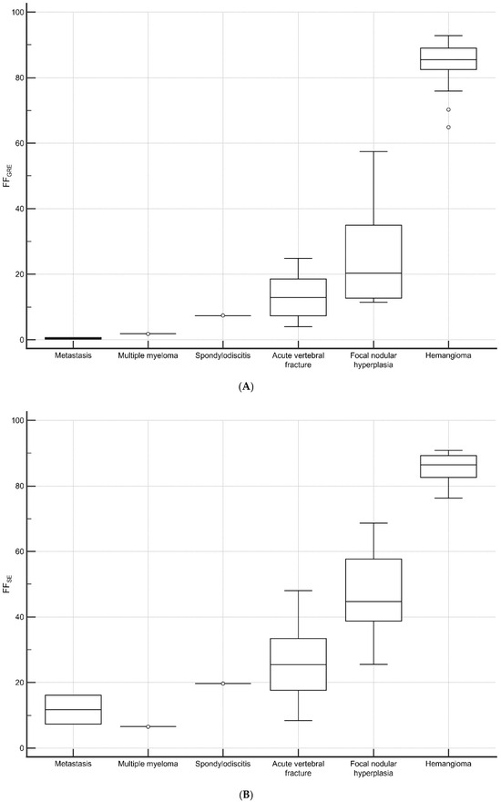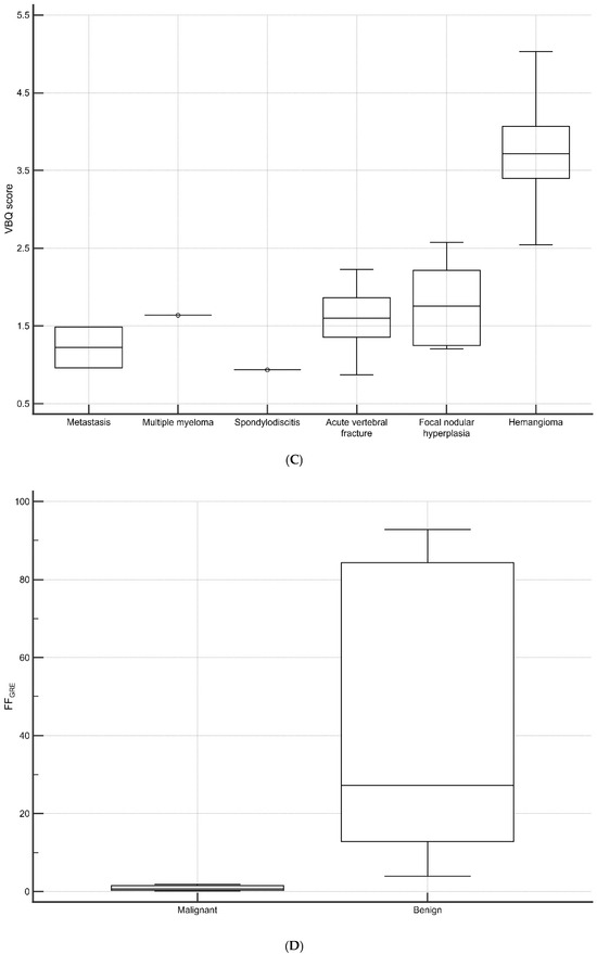 FF and the VBQ score for each lesion were presented in Figure 4. Benign lesions exhibited an FFGRE of 44.11 ± 34.29%, while malignant lesions showed 0.91 ± 0.86%. The two groups showed statistically significant differences (p = 0.004). Benign lesions were statistically significantly higher than malignant lesions in FFSE (54.46 ± 28.36% vs. 9.99 ± 5.32%; p = 0.007). However, the difference in VBQ score was not statistically significant (2.48 ± 1.18 vs. 1.36 ± 0.36; p = 0.089).