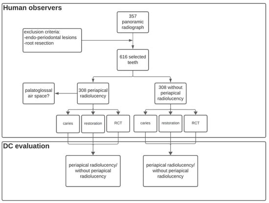 All radiographs were acquired at the Department of Oral Diagnostics, Faculty of Dentistry, Semmelweis University using an Orthopantomograph 3D Pro appliance (KaVo, Biberach an der Riss, Germany) with the following settings: 66 kV, 5.0 mA, and 16 s. The selection was performed using the department’s patient archiving and communication system (IMPAX software, v.6.5.2.657, Agfa HealthCare, Mortsel, Belgium). The human observers were allowed to adjust the brightness or contrast and were able to use magnification in the IMPAX software. The PRs were evaluated on a Samsung S24F350FHU (Samsung, Seoul, Republic of Korea) (full HD, resolution: 1920 × 1200 pixels) monitor. The metadata for the selected radiographs were documented, including the study date, patient age, and the specific tooth and its group depicted in the radiograph. This information was stored separately from the downloaded anonymized image data. The applied DC system was provided only by the encrypted anonymized image files. The study protocol was performed in accordance with the Declaration of Helsinki and approved by the Semmelweis University Regional and Institutional Committee of Science and Research Ethics (SE RKEB 138/2020). Access to the collected anonymized image files was restricted to observers, while only human observers had access to the metadata. It is important to note that the sample selection process did not favor any particular sex.