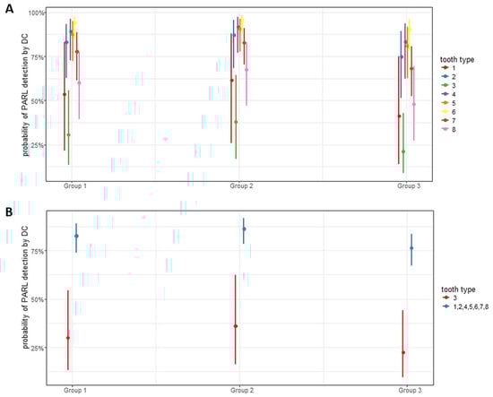 The results of the logistic regression models showed that the tooth type has a significant effect (p < 0.0001) on the prediction rate of DC. The AI-based system showed lower probability values for detecting PARL in the case of central incisors, wisdom teeth, and canines, with the latter showing the lowest values (Figure 2). In line with this result, the sensitivity and diagnostic accuracy of DC for detecting PARL on canines showed lower values at 0.27 and 0.64, respectively (Table 2).