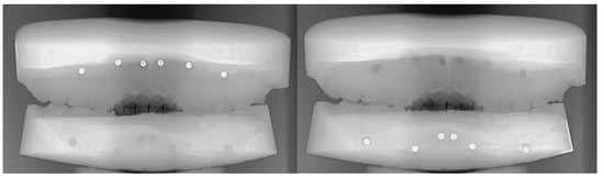 Panoramic radiographs of the prepared casts. The round opacities show the undistorted depiction of the embedded aluminum balls.