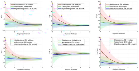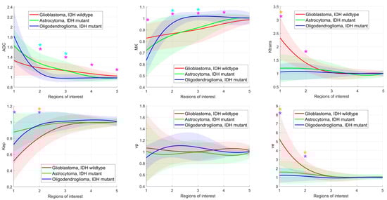 Glioma subgroup comparisons of the apparent diffusion coefficient (ADC), mean kurtosis (MK), and the dynamic contrast-enhanced (DCE) MRI parameter volume transfer constant (Ktrans), reflux exchange rate (Kep), fractional volume of plasma (vp), fractional volume of extravascular extracellular space (ve), cerebral blood volume (CBV), time to peak (TTP), peak, area under the curve (AUC), wash in, and wash out. Values between regions of interest are interpolated. Light bars represent the mean values ± the standard deviation of each parameter. Significant differences are marked with an asterisk (*) above the graphs (yellow *: differences between glioblastomas, IDH mutant and astrocytomas, IDH mutant; turquoise *: differences between astrocytomas, IDH mutant and oligodendrogliomas, IDH mutant; pink *: differences between glioblastomas, IDH wildtype and astrocytomas, IDH mutant).