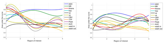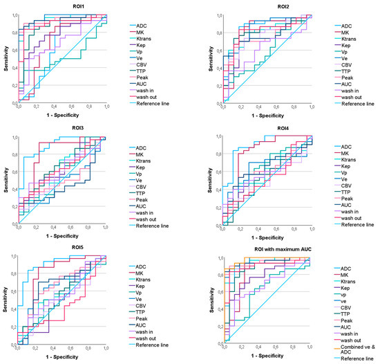 Significant AUC values were found for the parameters ADC, MK, Ktrans, cp, and ve (see Figure 6, Table 3). The AUC values differed depending on the ROI (see Figure 5).