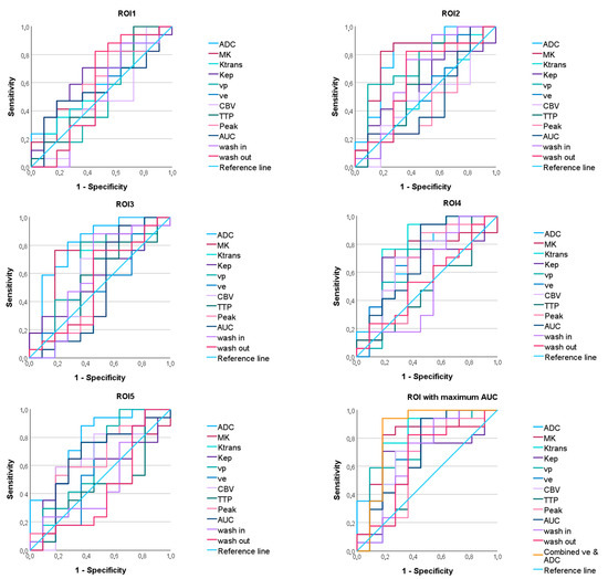 The ROC curve analysis revealed significant AUC values for the parameters ADC and MK and the DCE-MRI parameters Ktrans, Kep, ve, CBV, TTP, Peak, AUC, wash in, and wash out, with sensitivity, specificity, and AUC varying between the ROIs (see Figure 4, Table 2). While the DCE-MRI parameters revealed the highest AUC in ROI1, ADC and MK reached their maximum AUC in ROI5 and ROI3 (see Figure 5, Table 2).