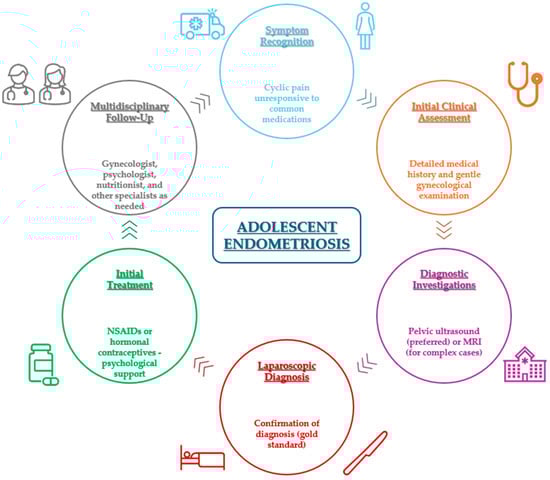 Endometriosis is an estrogen-dependent chronic inflammatory condition of unclear etiology, characterized by the presence of endometrium-like epithelium and/or stroma outside the uterus [1]. Primarily affecting women of reproductive age, it can begin as early as the onset of menarche during adolescence and may persist beyond menopause [2,3]. Although its exact prevalence remains unknown, it is estimated that approximately 10% of women and girls of reproductive age are affected, representing roughly 190 million individuals worldwide [4]. Around 67% of endometriosis patients report experiencing symptoms before the age of 20 [5]. The diagnostic and therapeutic pathway for adolescent endometriosis involves several critical steps, from symptom recognition to multidisciplinary follow-up (Figure 1). The most common symptom of endometriosis during adolescence is severe menstrual pain, which interferes with daily activities, social relationships, and school attendance and is poorly responsive to non-steroidal anti-inflammatory drugs and/or oral contraceptives [6,7,8]. Other common symptoms include chronic pelvic pain (CPP), dyspareunia, dysuria, dysmenorrhea, abnormal menstruation, infertility, and gastrointestinal discomfort [9]. On average, patients spend about 10 years searching for a diagnosis.